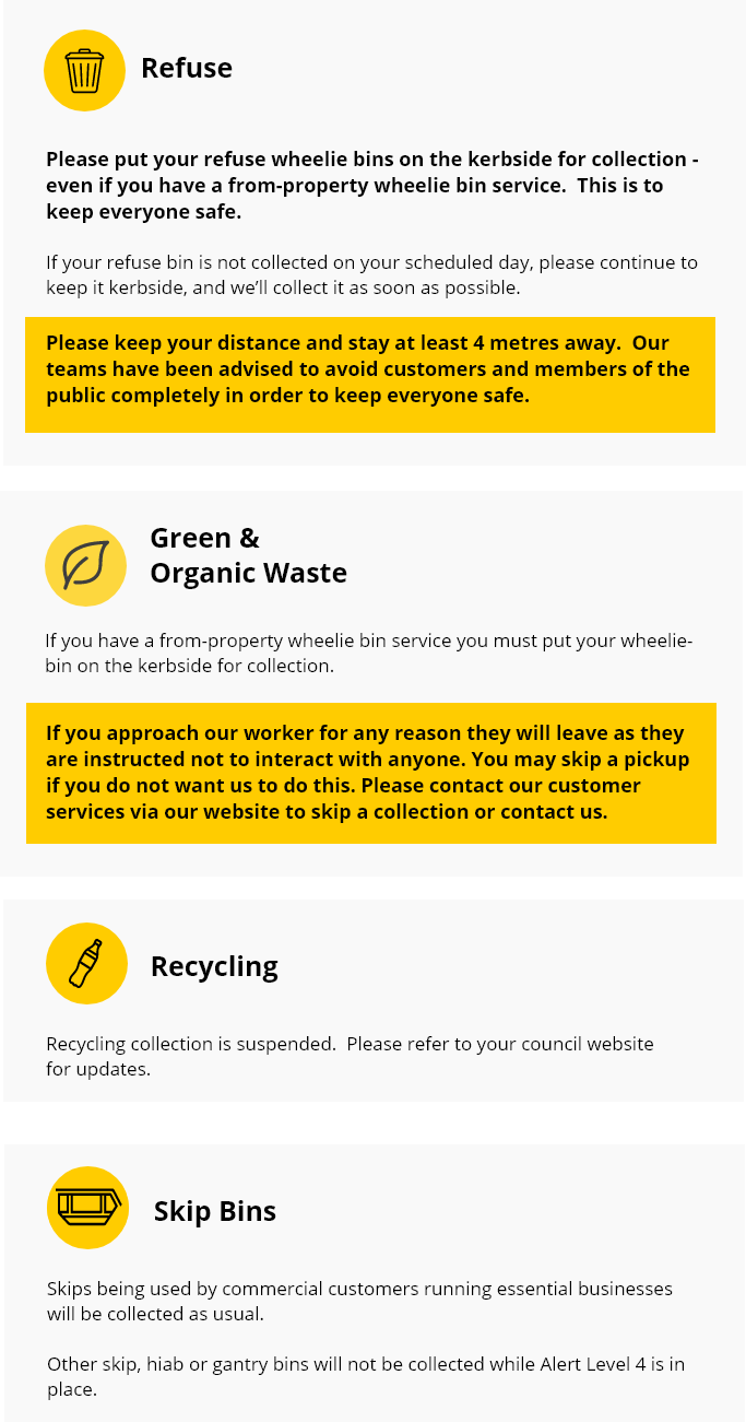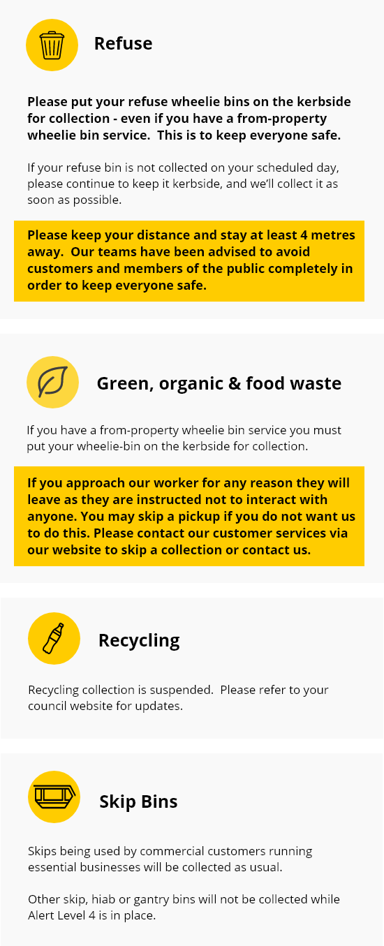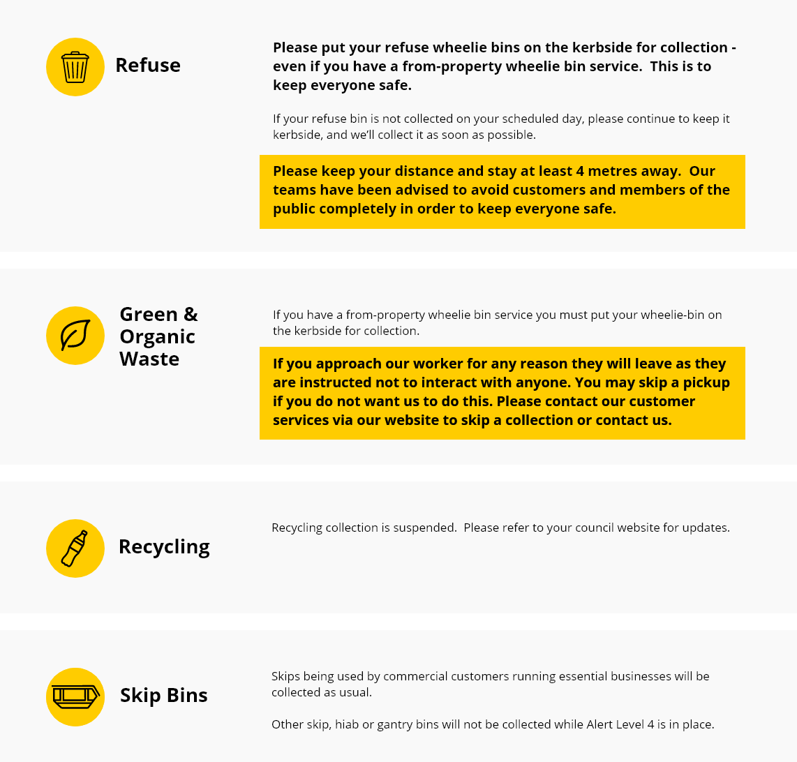 Waste collection is an essential service and we will continue to collect your waste and recycling during Alert Level 4.